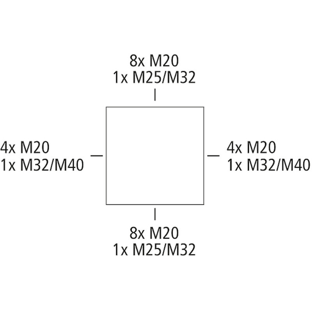 Included accessories:8 IP54 M20 cable glands, sealing range 8 – 13.5 mm, 2 IP54 M25 cable glands, sealing range 9 – 18.5 mm, 1 IP54 M32 cable gland, sealing range 13 – 23 mm.